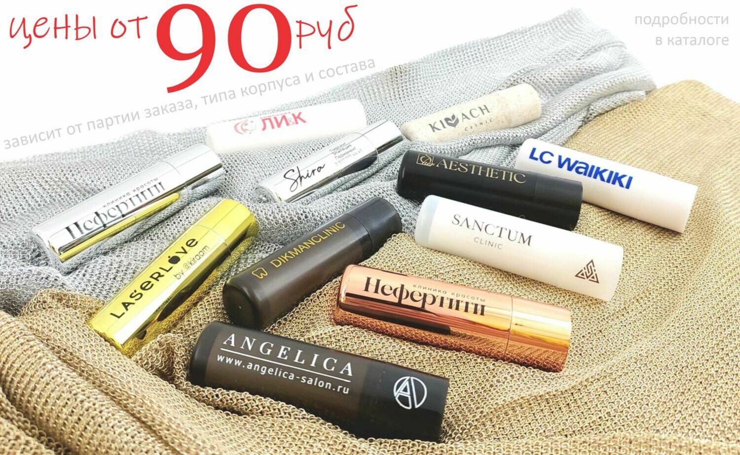 У нас можно заказать гигиенические помады под нанесение по низким ценам, так же сразу можете заказать и нанесение логотипа на поверхности корпуса гигиенической помады. Стоимость нанесения на гигиенические помады зависит от партии заказа. Доставляем гигиенические помады с логотипом по всей России. Минимальная партия всего 500 штук.